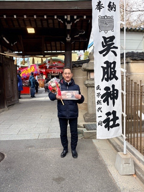 本年も、呉服神社へ十日戎に行ってまいりました。十日戎(とおかえびす)は、毎年1月9日から11日まで行われる日本の伝統的なお祭りで、商売繁盛や家内安全を願って恵比寿様を祀ります。