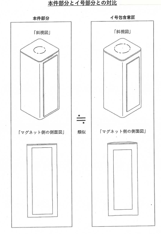 (要旨)本件意匠に係る商品の使用態様は壁面に取り付けた状態で使用することもできるというものであり、そのため本件意匠に係る商品の需要者は壁面取付け時に壁面取付けのために機能するマグネットを含めた容器の背面(壁取付面)の具体的な形状に最も注意を惹かれるものと認められることからすると、その使用態様が本件意匠に係る商品と同様である被告商品においても、需要者は、壁面取付け時に壁面取付けのために機能する部材であるところの背面部の縦長長方形のマグネットとその上端及び下端に設けられた横長棒状の防滑シートで画された部分に最も注意を惹かれるものと認められる。そして、マグネットと防滑シートは、部材が違うけれども、いずれも黒っぽい色であって周囲が突出した枠で囲まれているため、需要者は通常上記両部材を一体のものとして観察するのが自然と解されるから、被告意匠の背面部における本件意匠の背面部(右側面図)において意匠登録を受けようとする部分に相当する部分は、縦長長方形のマグネットとその上端及び下端に設けられた横長棒状の防滑シートで画された部分(原判決別紙乙4意匠(図面)の背面図において部分意匠として意匠登録を受けようとする部分参照)とするのが相当である。そうすると、本件意匠と被告意匠を対比する際に防滑シートは本件意匠の権利範囲外に設けられたもので比較する必要がなく、類比判断に影響しないとする一審原告の上記主張は、本件意匠との対比に必要な被告意匠の構成の一部を恣意的に除外しようとするものであって採用できないというべきである。